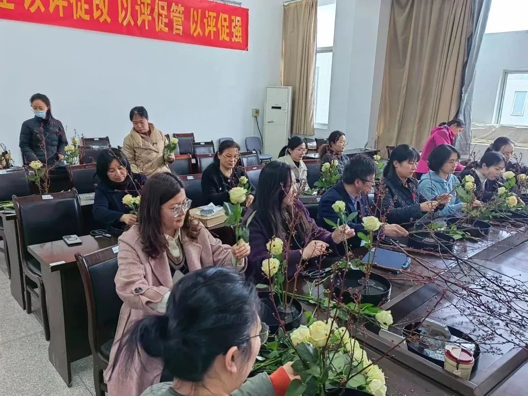 活动现场,徐老师从传统插花理论三部曲开始讲起,结合插花空间展示、造型法则、色彩搭配及鲜花养护做了细致而详细的讲授,并当场示范传统插花的经典样式。在徐老师的艺术熏陶下,现场女教师们热情高涨、跃跃欲试。她们或与徐老师积极交流探讨中西方插花技艺的区别;或已经迫不及待投入选材、剪枝、扦插等工序;还有在完成自己的插花造型后意犹未尽地协助他人调整花型、分享美的感受。万物亦有灵,花亦可解语。不一会儿,普通的花叶、枝条在老师们手中变成了令人赏心悦目的艺术品。高雅的玫瑰、别致的灯台条、沁人心脾的香雪兰……它们以各种造型组合到一起,或柔美妩媚,或挺拔坚毅,或随心随性、不拘形式,或高低错落、疏密有致。在愉悦的轻松氛围当中,女教师们共同体会传统插花技艺的无穷奥妙,共同享受传统插花艺术闲情逸趣,也更加坚定中国传统文化自信和民族自豪感。