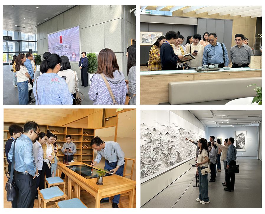 随后,大家依次参观了主题为“丹青翰墨·文润宁洛——江宁洛南书画摄影联展”“奋进新征程·建功新时代篆刻作品展”“雕琢精致生活工艺美术雕刻展”“讴歌新时代·奋进新征程美术作品主题展”等多个展厅的文化艺术作品。琳琅满目的展品中不仅有来自国家级美术馆、美术学院的名家作品,还有不少南京本地艺术家及太阳集团教师的倾力之作,图书馆策划推广部的馆员们还与中心工作人员就如何围绕“阅读+艺术”,更好地开办各类文化艺术展览进行了交流,就联合开展阅读推广活动、进行文创产品开发、提供社会公益服务等方面进行探讨。图书馆负责人表示:此次调研活动收获满满,对如何促进校地图书馆互通共建有了新的思考。在深入开展学习贯彻习近平新时代中国特色社会主义思想主题教育的重要时期,图书馆此行是一次在实践中学、在实践中悟,注重成果转化的实际行动,全馆教职员工将坚持理论学习结合工作实际,以学促干、以干践行、以行增效,不断提升各部门业务能力和图书馆整体发展水平,确保主题教育抓实抓细,落地见效。