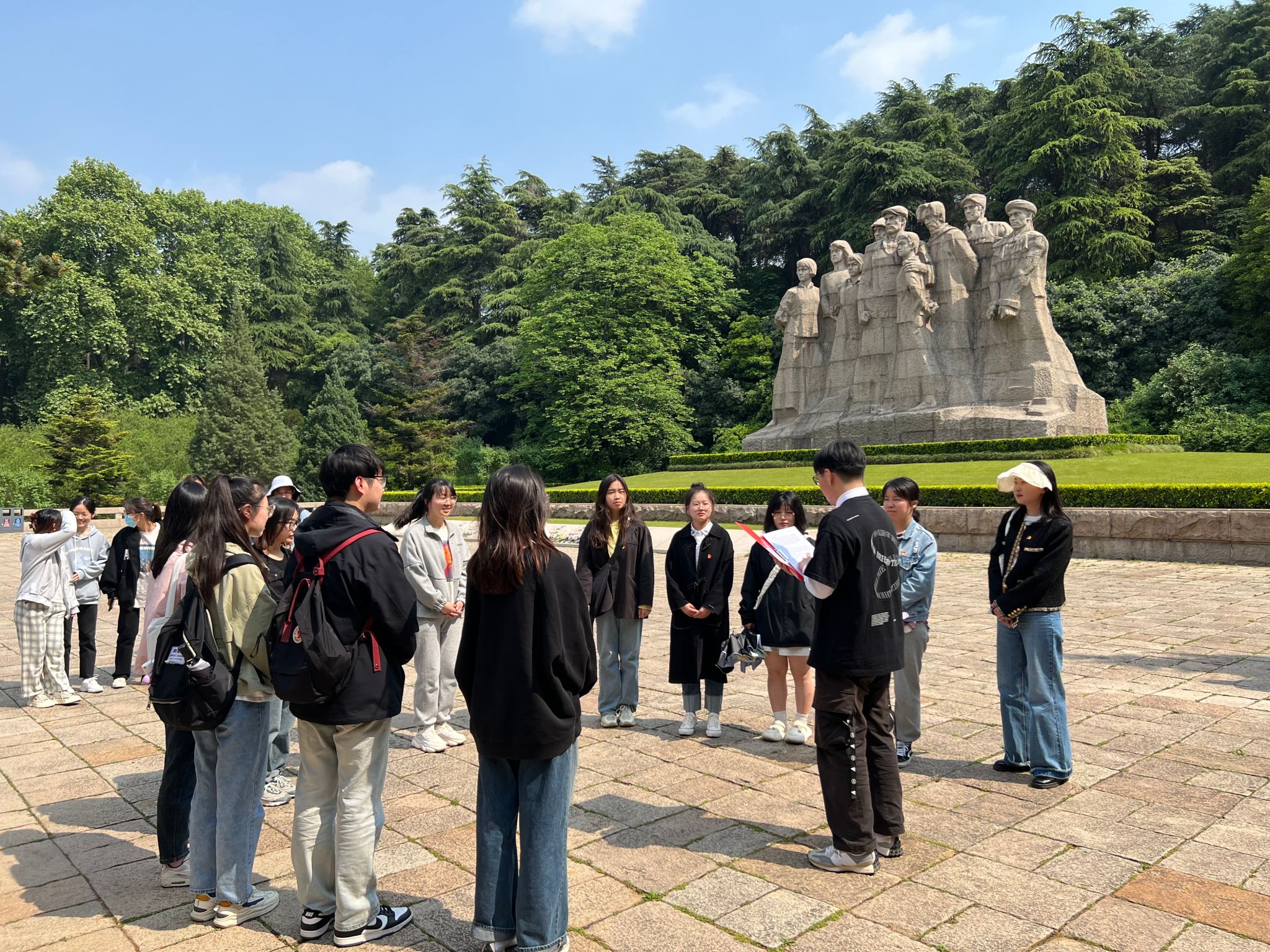 随后,全体党员前往烈士就义群像。途中党员们驻足阿乐为丁香烈士种植的那棵丁香树前,聆听英语专业学生支部书记为大家讲述这对革命爱侣的事迹。烈士就义群像前,学生党员代表饱含深情地朗诵了来自史砚芬、孙晓梅等革命烈士的家书,在字里行间感受雨花英烈们壮丽的革命事业和丰富的精神世界。“家书,蕴含着强烈的时代主题和历史沧桑。”在场党员阅读这一段段写在残破纸张上的话语时,都被烈士们的理想、信念、情操、境界感动了,纷纷表示要从中汲取不断奋进前行的精神力量,为建设中国式现代化强国贡献青春力量。