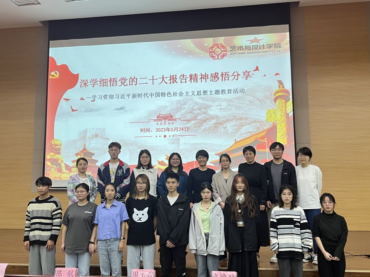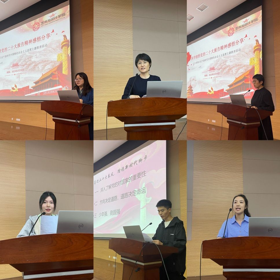 10位学生代表密切联系自身实际,分享学习感受,畅谈贯彻打算。设计2200陈悦同学以一封给习近平总书记的信的形式,汇报了团支部和个人对党的二十大精神的学习情况;预备党员张亿君同学表示,成长于繁荣年代的00后更包容更开放,是未来的塑造者,当代青年将怀抱坚定的理想信念不懈地追求,奋力书写新时代的华章。教师党支部书记闫胜昝老师讲述了自己学习党的二十大精神的深切体会,并结合自身的求学经历给予同学们学业和生活上的指导;徐寅岚老师则从一名艺术类教育工作者角度,与大家探讨如何在设计中讲好中国故事、展现中国形象。活动最后,该院党委书记周玉霞以一名普通教师党员的身份,从学思想、强党性、重实践、建新功四个方面与同学们分享了学习心得,鼓励青年学子志存高远、脚踏实地,在实现中华民族伟大复兴的时代洪流中踔厉奋发、勇毅前行。