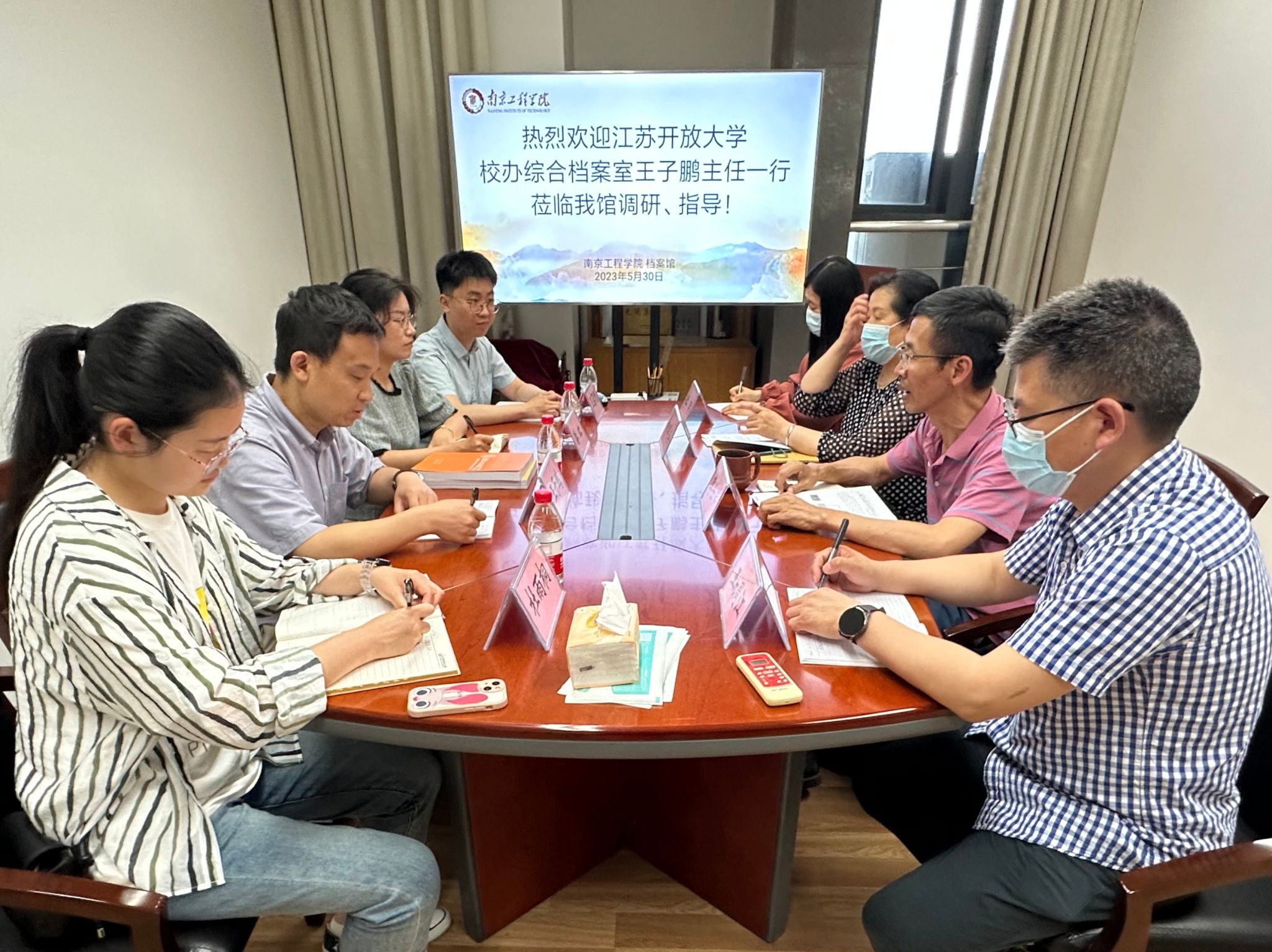 李士芹馆长从历史沿革、机构设置、库房建设、档案校院二级管理、数字化建设等方面介绍了太阳集团档案馆的基本情况,王子鹏主任介绍了江苏开放大学档案工作的基本情况。针对江苏开放大学档案工作的实际情况,柳群英主任从制度建设、库房建设、数字化建设等方面提出了诸多建议。双方在档案资源建设、数字化建设、人才队伍建设等方面进行了积极交流。