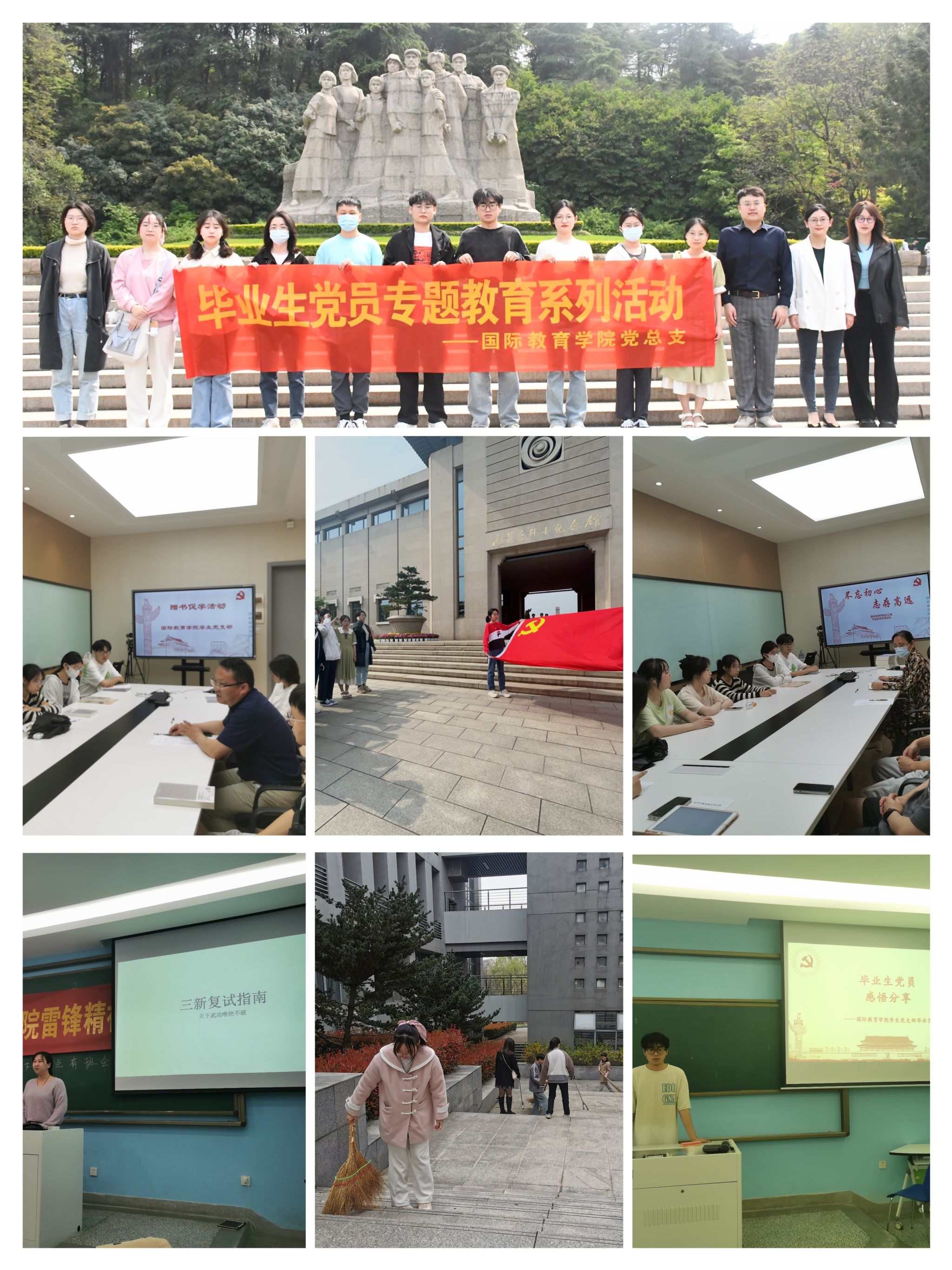 学院组织毕业生党员前往雨花台烈士陵园开展主题党日活动,革命先烈们至死不渝追求共产主义理想信念和不怕牺牲的大无畏革命精神给同学们以深刻的灵魂洗礼。“这既是一堂生动的党史课,也是一次深刻的党性教育。”全体毕业生党员面朝党旗,握拳过肩,重温入党誓词,表明了对中国共产党忠贞不渝的革命热情和为共产主义奋斗终身的坚定决心,纷纷表示将以更加饱满的热情投身各自工作。在毕业生党员座谈会上,国际教育学院党总支书记刘树春为每一位毕业生党员赠送了《苦难辉煌》一书并希望他们在学习的路上坚定初心、砥砺前行,不断提高学习的主动性和自觉性,加强对党的政策和理论知识的学习,永远保持共产党员的先进性,继续在工作岗位上发挥先锋作用。