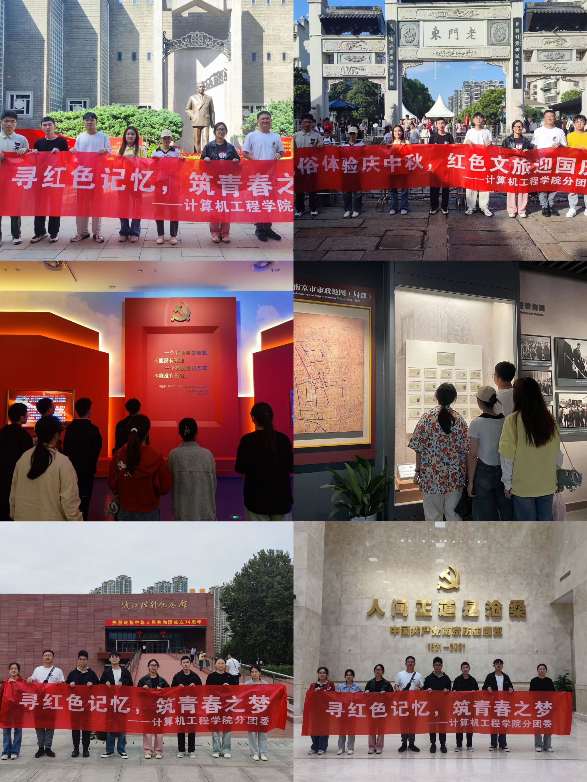 民俗体验庆中秋,红色文旅迎国庆。月与国同辉,人与家团圆。计算机工程学院组织团学骨干赴南京党史馆、梅园新村、渡江胜利纪念馆、老门东等地开展“民俗体验庆中秋,红色文旅迎国庆”主题团日活动。在梅园新村,同学们参观了中国代表团外事组、新华社南京分社办公和居住处,在学思践悟笃行中传承红色基因,用实际行动追寻红色足迹。在南京夫子庙、老门东等民俗景点,同学们沉浸式体验打卡中秋花灯制作、手书团扇、非遗文化展示等,在浓厚的节日氛围中加深对中华传统民俗文化理解,增强文化自信。在南京党史馆和渡江胜利纪念馆内同学们通过翻阅革命文献、观看珍贵影像资料,重温革命历史,感悟信仰的力量,进一步增强了爱国主义情怀和民族自豪感。