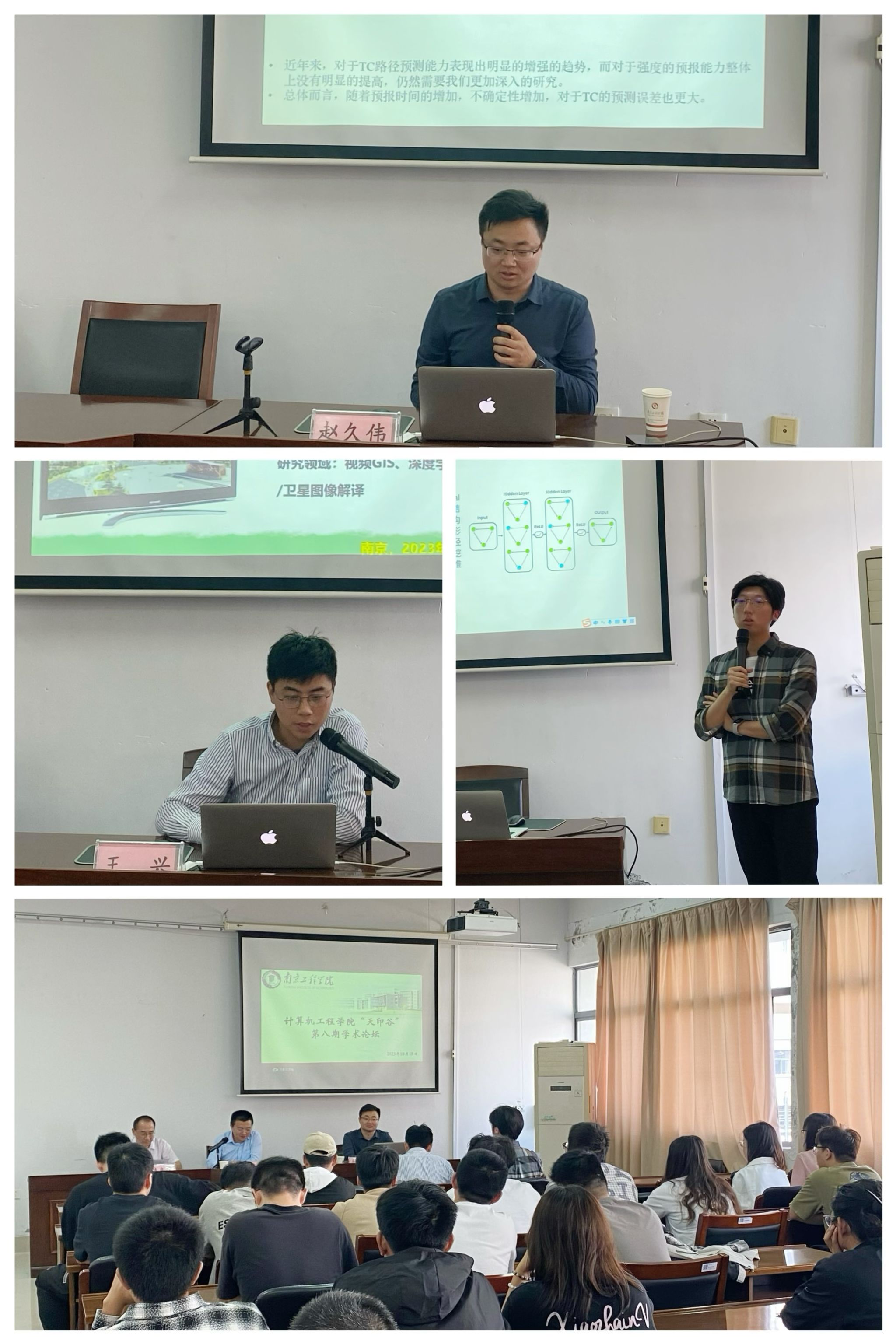 讲座中,赵久伟围绕台风灾害这一主题,结合先前的研究经验,详细为大家介绍了以机器学习、深度学习等为代表的人工智能方法在台风强度评估中作用和未来可能带来的改变与机遇。王兴分享了以监控相机这一崭新视角,采用机器学习、深度学习等策略,对地表降雨进行观测,服务于高时空分辨率降雨观测手段的构建。崔诗程分析讲解了图神经网络的基本理论、算法原理、关键技术以及应用情况,重点介绍图卷积网络、图注意力网络等关键技术以及在社交网络分析领域中的最新研究成果。在交流环节,师生们踊跃提问,与论坛嘉宾就数据安全、方法原理等问题进行了交流。