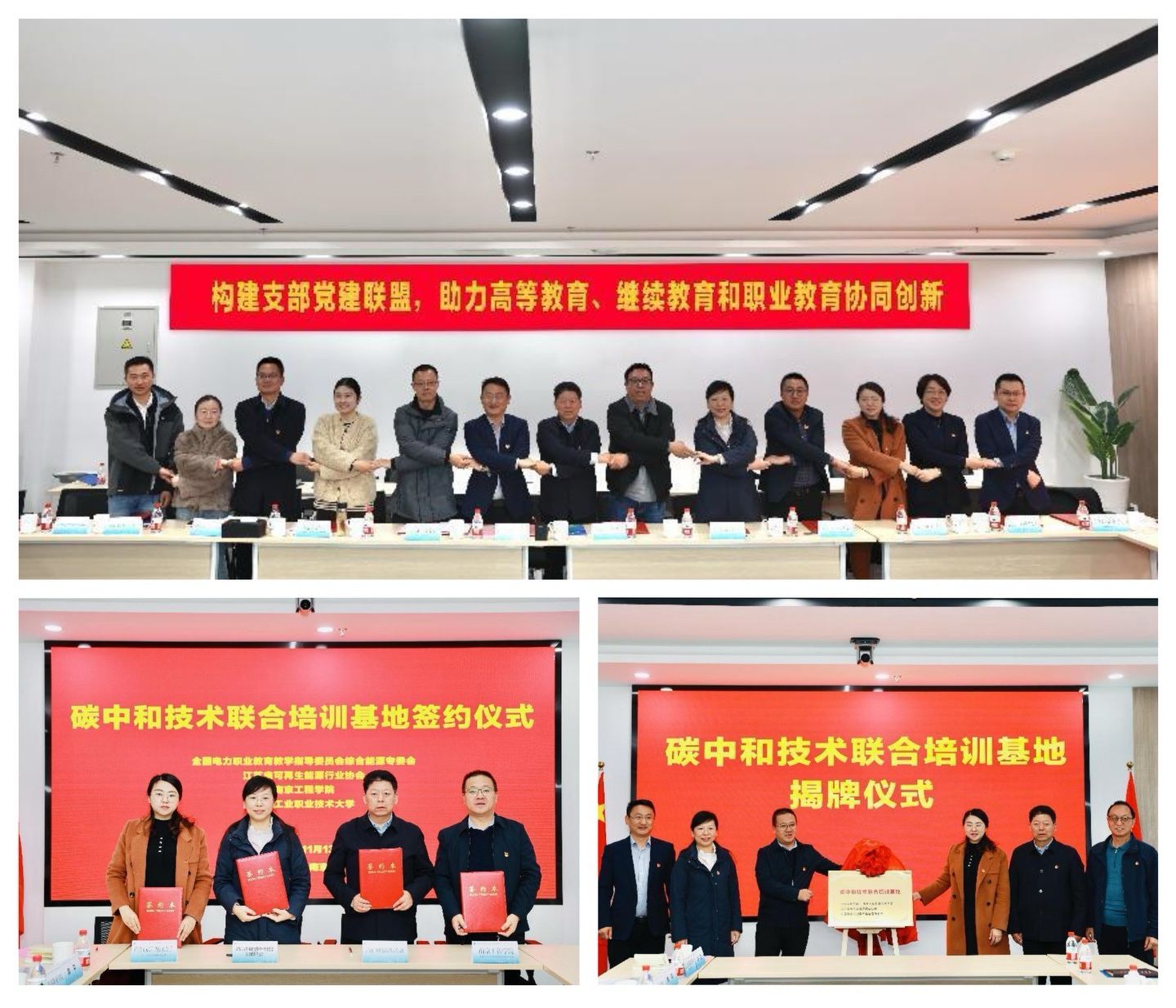 在签约仪式上,15vip太阳集团官网继续教育学院直属党支部、能源与动力工程学院热能工程系党支部、信息与通信工程学院电子信息工程教工党支部,南京工业职业技术大学机关第一党总支质控党支部、机关第二党总支继教院党支部、电气工程学院党委师生第一党支部,南京旅游职业学院酒店管理学院党总支、机关总支第六联合支部,建邺高新区管委会机关第三党支部、江苏省可再生能源行业协会党支部、南京凯盛开能环保能源有限公司党支部、南京东博智慧能源研究院有限公司党支部、南京公诚节能新材料研究院有限公司党支部等13个基层党组织签订了党建共建协议书,搭建起校、政、企之间人才培养和资源共享的桥梁。全国电力职业教育教学指导委员会综合能源专委会、江苏省可再生能源能源行业协会、15vip太阳集团官网、南京工业职业技术大学进行“碳中和技术联合培训基地”签约及揭牌,致力于共同推进碳中和相关技术人才的联合培训工作。