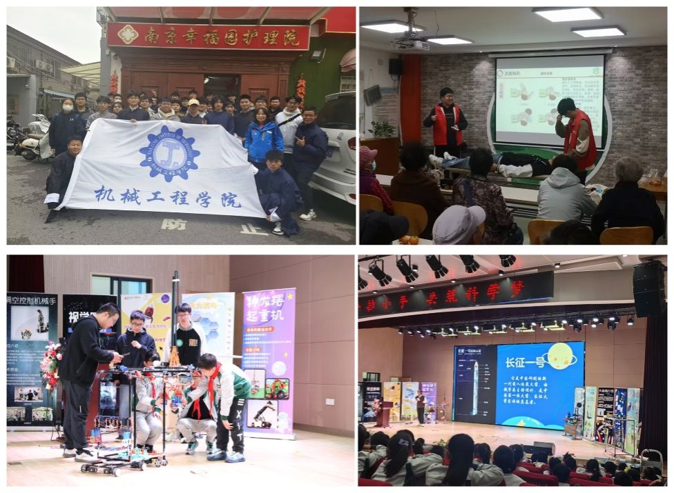 “实”字为重,志愿服务显担当。各团支部积极将所学所思转化为实际行动,开展校内外志愿服务,主动承担社会责任,展现青年力量担当。机电类2301团支部前往南京幸福园护理院,清洁卫生环境,与老师闲话家常,并为他们表演了自己创作的小短剧。机电221团支部走进紫鑫城社区,开展了电路应急知识的科普宣传活动,指导社区居民建立起安全用电的正确理念。机电222团支部跟随机械工程学院科创团队“小种子”成长计划来到南京市齐武路小学,开展科普活动进校园活动,带领小学生们一起发射火箭飞行器模型、放飞飞机模型,亲手操作模型小车、3D打印机等,真正零距离“触摸”科技的神奇。