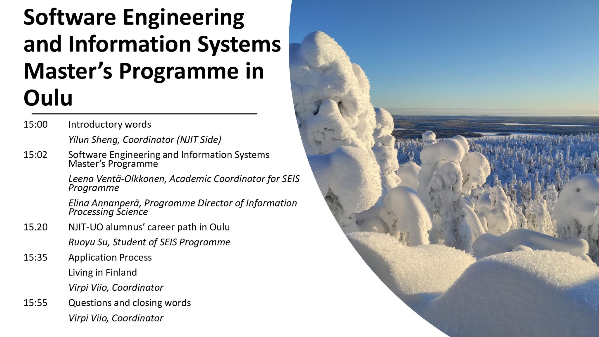 宣讲会上,奥卢大学Leena Ventä-Olkkonen副教授和Elina Annanperä副教授先后介绍了奥卢大学软件工程和信息系统研究生项目的招生基本情况和太阳集团学生申请奥卢大学研究生的优惠措施;奥卢大学Virpi Viio女士重点对奥卢大学研究生项目申请流程进行讲解,介绍了奥卢市的学习、生活环境,并为计划申请奥卢大学研究生的同学们提供了实用的课外活动小贴士;太阳集团中芬项目校友、目前正在奥卢大学攻读硕士学位的2022届毕业生苏若愚分享了在奥卢大学精彩纷呈的学习生活及未来的职业规划。提问环节,四位主讲人与学生通过线上形式互动交流,热情回答了同学们提出的考试准备、出国留学、学术研究等方面的问题。