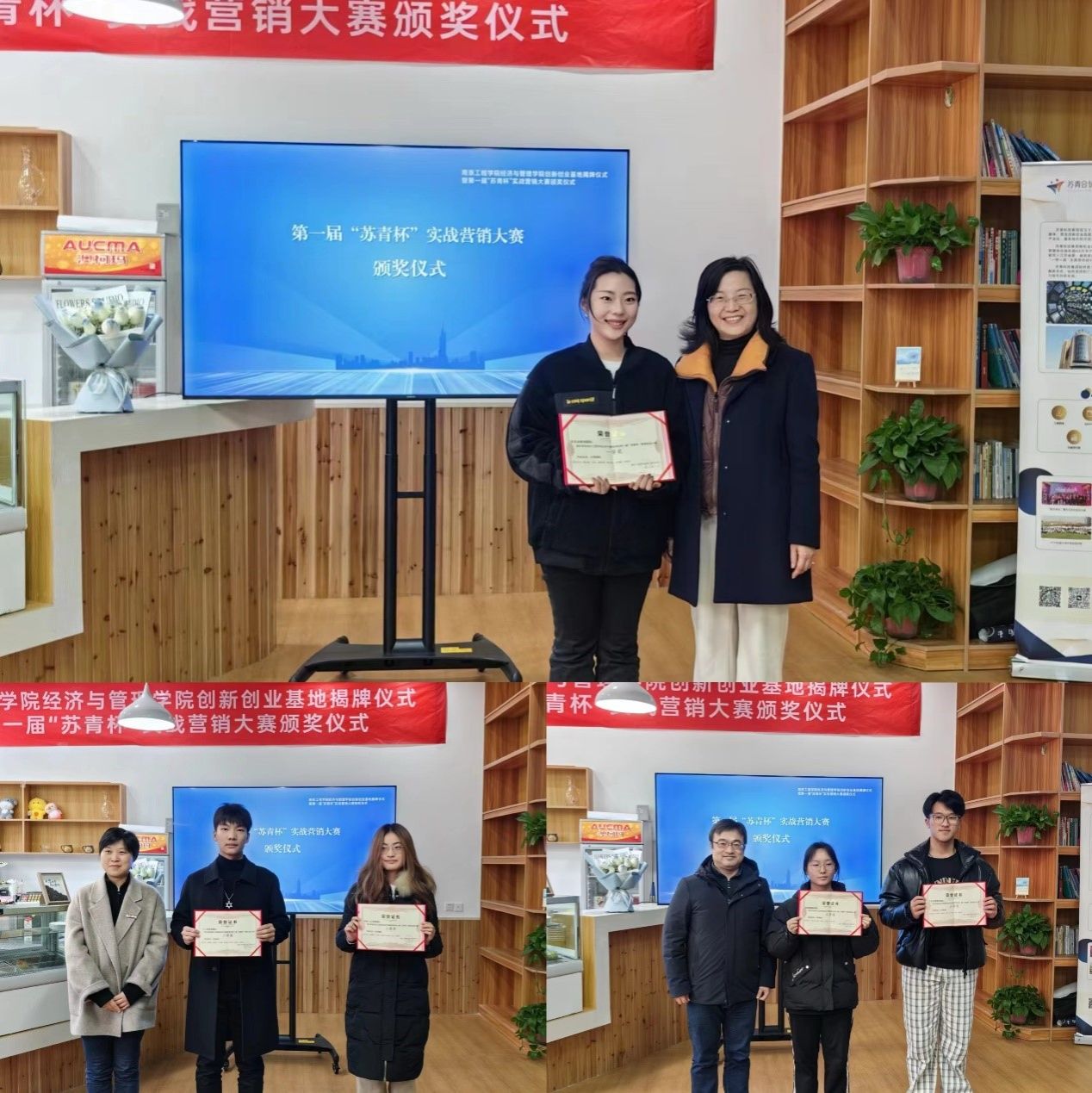 揭牌仪式后,与会领导为经济与管理学院第一届“苏青杯”实战营销大赛的获奖团队颁奖。“在母校学到的专业知识、培养的双创意识和能力为我之后的创业打下了良好基础。”刘伯敏代表大赛主办单位致辞,他向母校、母院对大学生双创教育的重视表示感谢,并希望通过赛事的举办、通过创新创业基地的建立,激励学弟学妹们不断奋进,挑战自我,在实践历练中发展自我,提升能力,为进一步推动学院的人才培养和创新创业教育贡献自己的绵薄之力。