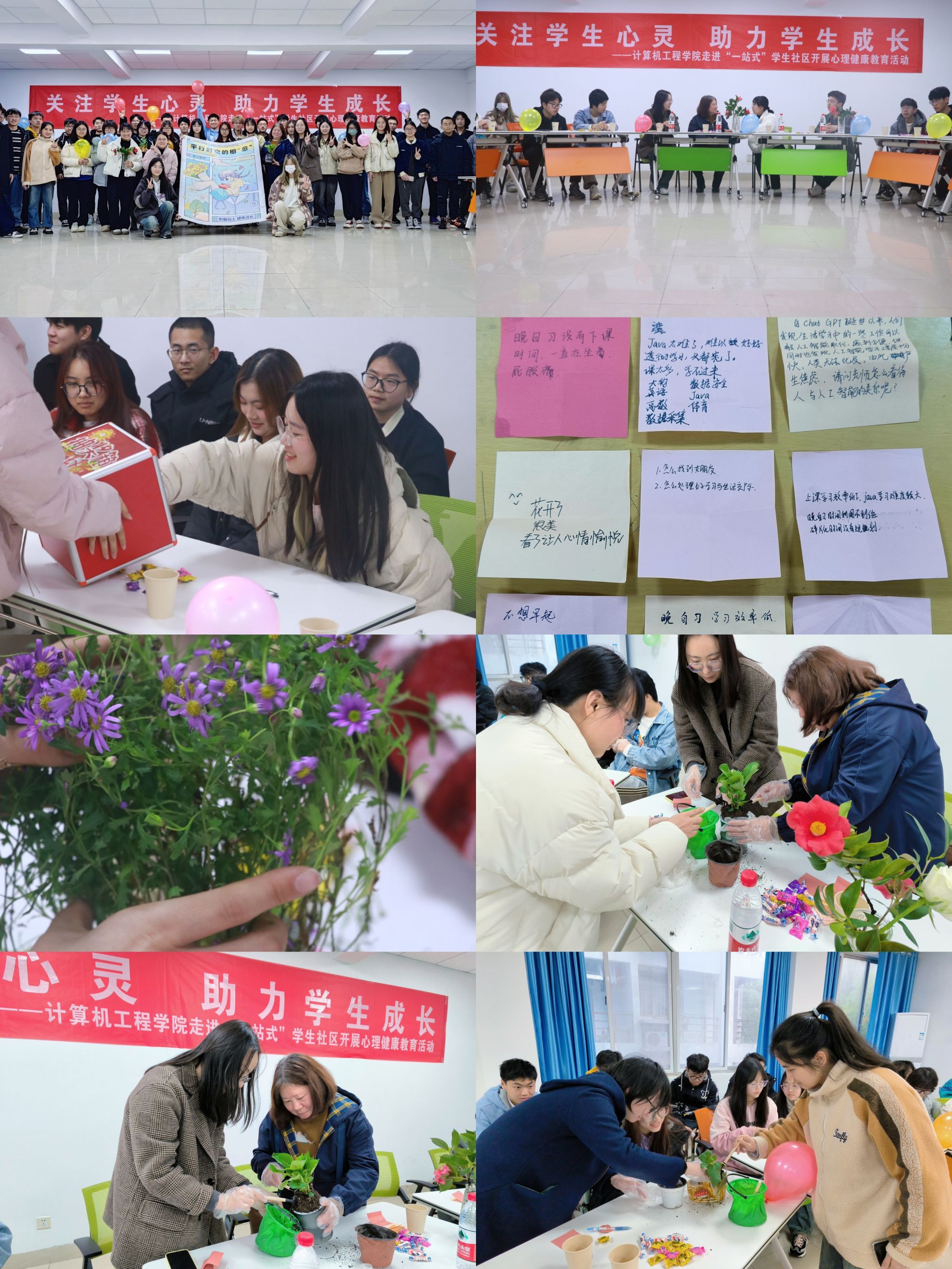 在“烦恼信箱”环节,同学们在信纸上纷纷写下自己在大学生活中遇到的困惑,有的表示自己刚进入大学,在专业课程学习中感到很迷茫,不知道未来何去何从;有的表示自己在时间规划上存在困难,不知如何合理安排时间以提高学习效率;还有的表示自己无法做好工作与学习之间的平衡……了解同学们的问题后,杨晨宜老师鼓励同学们放松心态,结合自己的兴趣爱好做好学业规划,她结合自己的教学经验,围绕专业课学习方法对同学们进行指导,对学生的学业规划以及心理状态给予针对性意见。在“希望充‘植’”环节,老师与同学们共同种下代表无限希望的向日葵、寓意美好的绣球和姬小菊,通过亲近植物帮助学生们培养积极健康的心理品质。参与此次活动的软件工程211班学生洪思祺说道:“我很开心能够参与此次活动,在今后的学习生涯中,我会与这株向日葵一起向阳而生!”