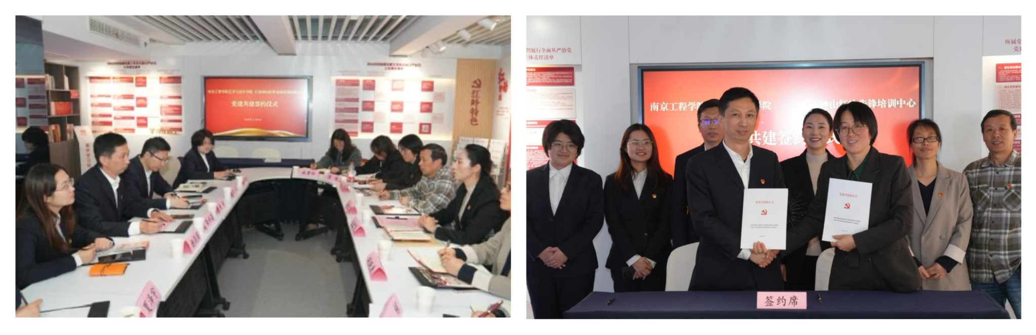 参观结束后,双方进行了深入的交流。徐兴昌对王雪飞一行的到来表示热烈欢迎,并从干部教育培训、职业技能认定、展馆设计制作、数字传媒创作、文创产品开发、会议会展服务等角度介绍了红岭先锋培训中心的概况。王雪飞也从历史沿革、办学规模、学科专业特色等方面介绍了学校和学院的基本情况,希望以专业为依托和钟山红岭先锋培训有限公司建立培训基地,共建共享,互利共赢。会上,江苏钟山红岭先锋培训有限公司支部委员会和艺术与设计学院艺美设计教工支部委员会签订了共建协议,双方在党员教育实境课堂和爱国主义教育基地培训等方面达成一致意见。