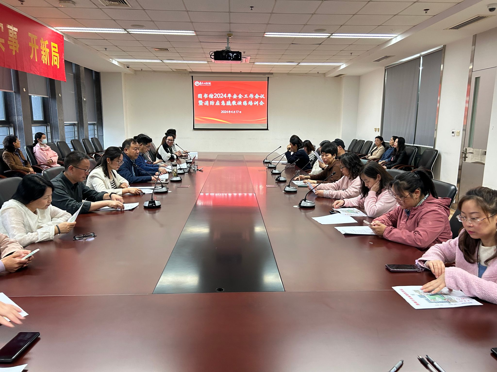 为了确保演练顺利开展,图书馆研究制定了《图书馆消防应急疏散演练预案》,对各演练小组成员的分工与职责进行全面部署,提前在图书馆网站、微信公众号及宣传海报发布演练通知。活动当天,图书馆组织开展全馆教职工的安全工作会议暨消防应急疏散演练培训会,强调学校对安全工作的要求,对近期图书馆安全管理的主要工作进行通报,对安全责任区域划分、安全责任落实提出具体措施,并对消防应急疏散演练流程、疏散路线、注意事项等进行集中学习。会上,各部门负责人还与馆领导签订了《15vip太阳集团官网图书馆消防安全责任书》。