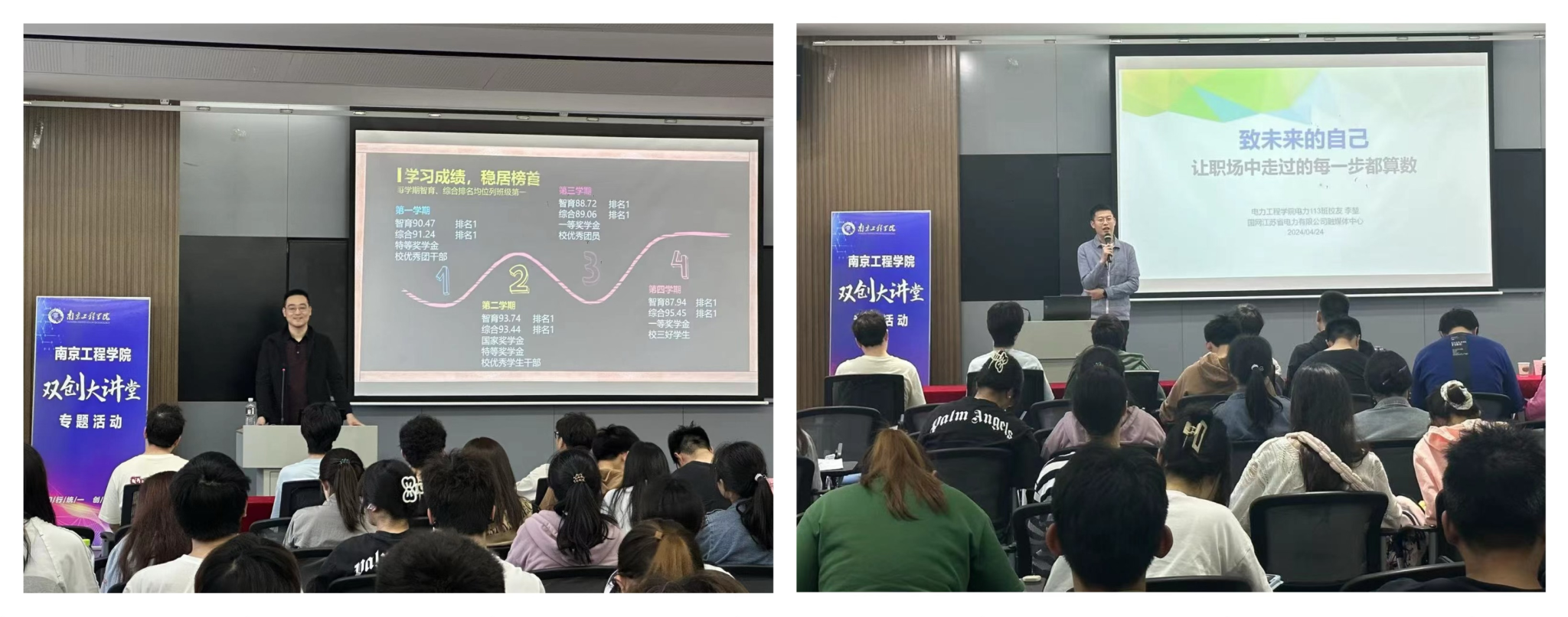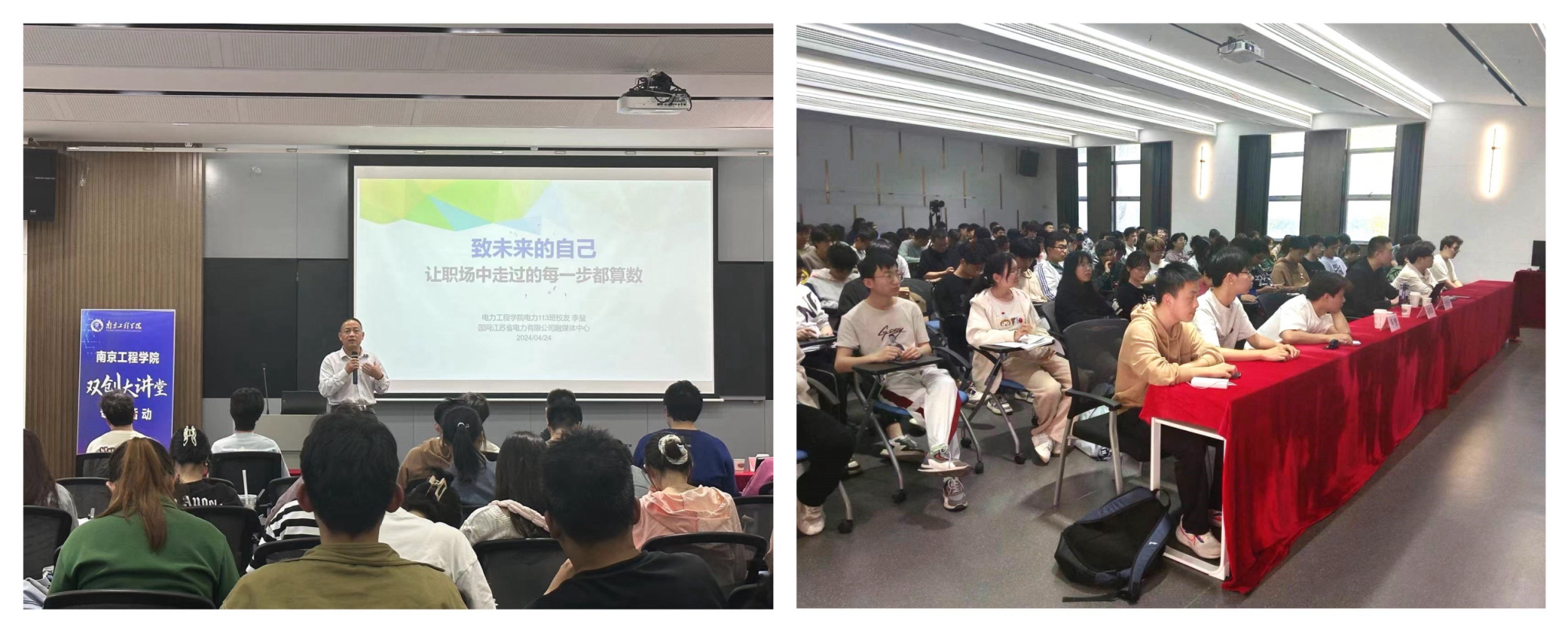 张权福以“大学生生涯规划与职业探索之旅”为题,结合自身在校与留学经历,分享了成长经验与感悟,叮嘱学弟学妹们要潜心求学,拼搏奋斗,积极参加科创项目研究、学科竞赛,充分利用母校提供的机会和平台,锻炼自己、提升自己。李堃以“致未来的自己——让职场中走过的每一步都算数”为题,用风趣幽默的语言讲述了自己从县级供电公司到市级再到省级公司的职业发展之路,鼓励同学们认准目标,脚踏实地,做到虽然脚下有泥,也要保持心中有光,用“好奇心、责任心、百折不挠的恒心和不忘的初心”应对职场中的“危”与“机”。