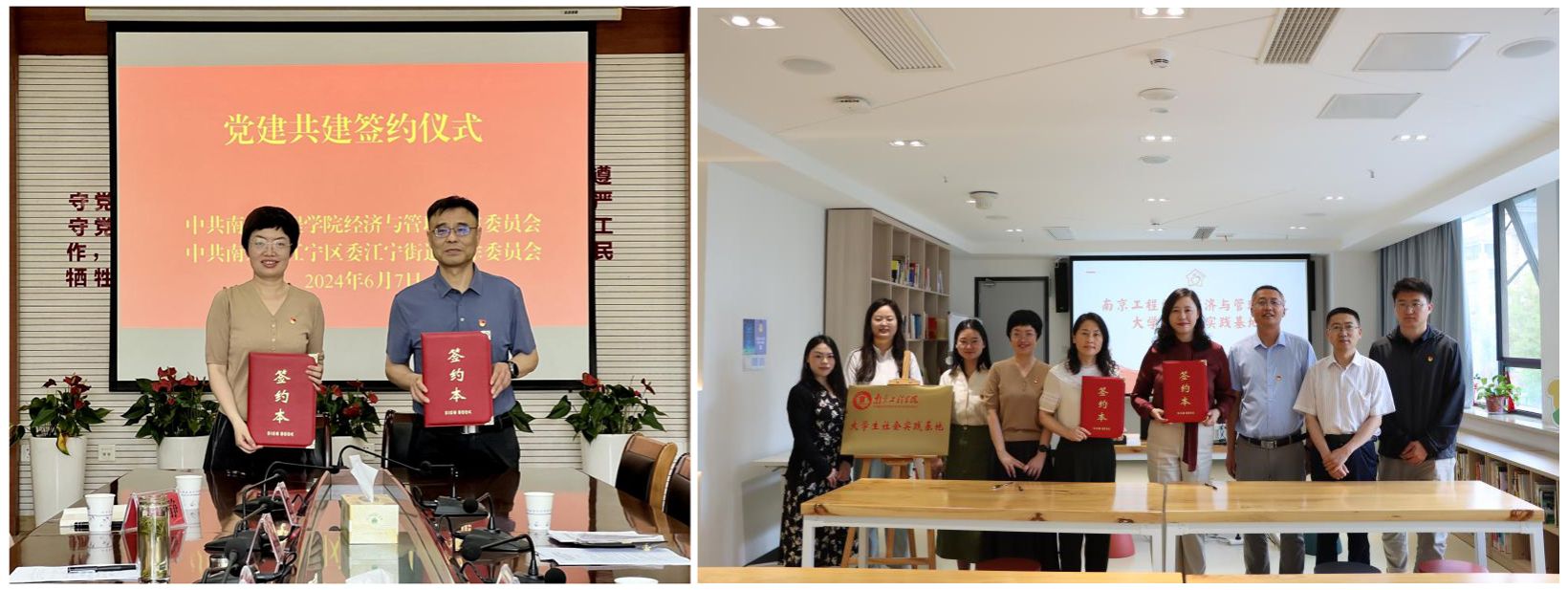 为共同推动基层党的建设、人才培养及美丽乡村建设迈上新台阶,构建结对帮带、双向促进、联合发展的党建格局,6月7日,经济与管理学院党委赴江宁街道开展党建共建签约暨实践调研活动。学院党委书记张文莉、党委副书记徐娟,党支部书记代表、社工和市场营销专业教师等参加活动。学院优秀校友、江苏省“最美社工”薛秋艳全程参与,为母校老师们重点介绍江宁街道社工站的运行情况和党建引领、五社联动的品牌特色,展示了专业社工人才在乡村振兴中的才干和作为。