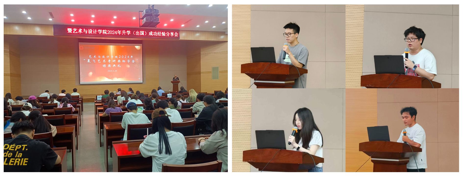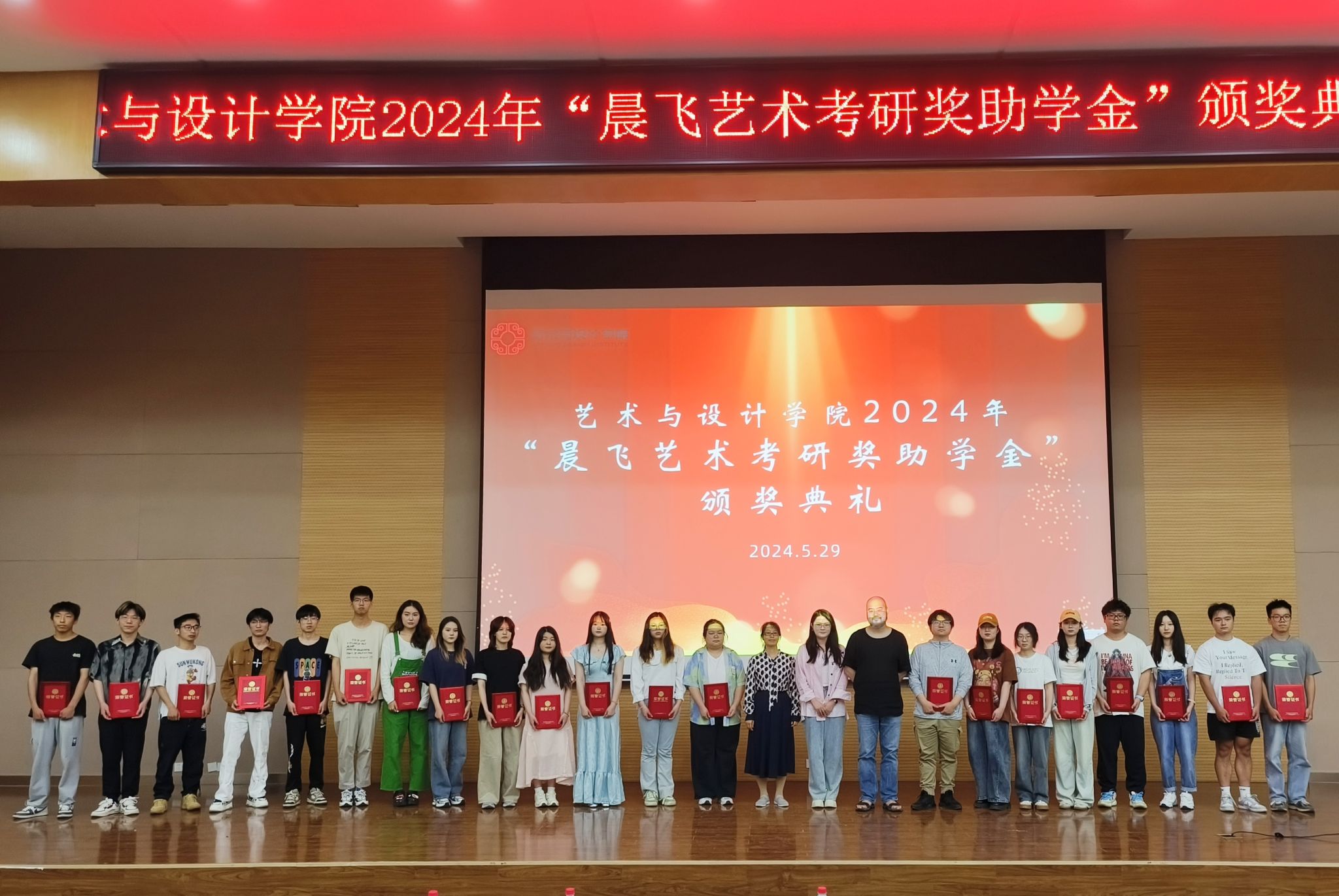 近日,艺术与设计学院2024年“晨飞艺术考研奖助学金”颁奖仪式暨升学(出国)成功经验分享会在学院动漫影视厅举行,学院党政领导、学工办老师、南京博思晨飞艺术文化发展有限公司负责人刘丽慧老师,2024届“晨飞艺术考研奖助学金”获奖学生以及2021级、2022级有考研意向的学生参与活动。