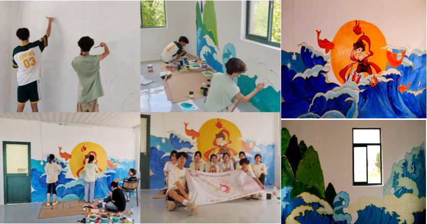 手绘乡村色彩,助美乡村环境。“艺绘青春”实践团以美术为媒介,用墙绘方式装点,美化乡村环境,助力绿美乡村建设。实践过程中,团队成员们以国风文化为元素,进行造型、图案、色彩的提取,经过刷白、打稿、填色、描边等系列工序,一幅幅精美的画卷跃然墙面。这些独具匠心的绘画作品让原本空白的墙壁变得色彩斑斓,实践团为美丽乡村新添一抹艺术亮色。