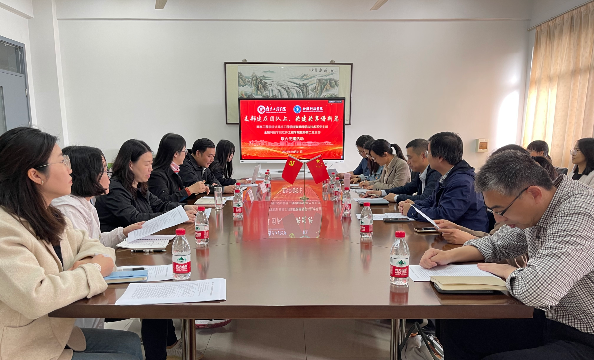 会上,王晓红对金陵科技学院软件工程学院教师第二党支部党员表示欢迎,介绍了计算机工程学院党建工作、学科发展、师资队伍建设及毕业生就业情况,分享了加强党支部建设经验,并表达了今后双方长期加强党建共建的想法和期望。戴军介绍了金陵科技学院软件工程学院基本概况、党建工作特色,并对学院“雨花英烈”精神传承和特色思政活动作了重点介绍,并诚挚邀请计算机工程学院党委组织师生前往考察交流。双方教师党员集体学习了习近平总书记在福建考察重要讲话精神,并结合本次共建活动主题进行了深入交流和研讨。