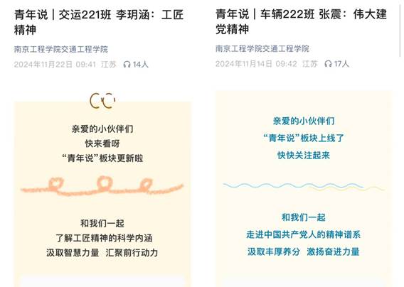 打造云端宣讲,营造浓厚氛围。学院党委依托学院微信公众号,设置“青年说”线上理论宣讲专栏,把中国共产党人精神谱系的伟大精神内容搬上云端,将其打造成接受党性教育、党史学习的新载体。组织优秀党员、入党积极分子录制音频,讲述伟大建党精神、工匠精神等精神谱系具体内容,在微信公众号上进行展播。通过线上平台,着力把内容讲“新”,把情怀讲“浓”,于润物细无声中全面推进宣传教育,营造“人人学、时时学”的浓厚氛围。