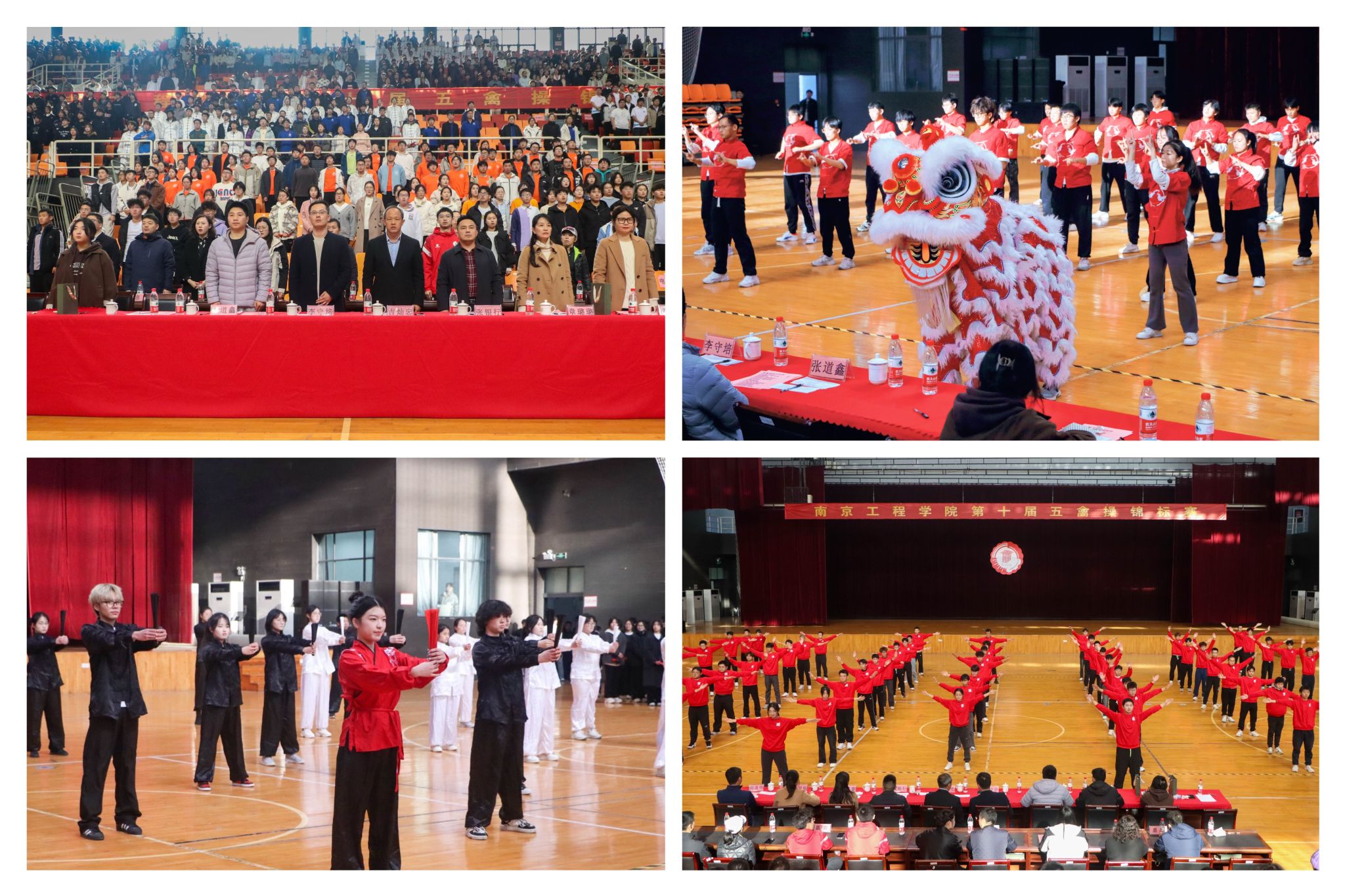 12月1日,天健苑·体育中心里锣鼓喧天、雄狮共舞,由学生工作处、团委、体育部主办,校武术协会、校龙狮协会承办的学校第十届五禽操锦标赛在此举办。比赛特邀南京师范大学体育科学学院副院长、学校民族传统体育学科带头人吉灿忠,上海体育大学中国体育历史研究院(中国体育非物质文化遗产研究院)副院长李守培,扬州大学体育学院副院长、体育工作部副主任张银行,南京工业大学体育学院副教授、武术国际级裁判章璐璐,江苏第二师范学院教师刘汲伟,南京体育学院教师张道鑫作为评委。