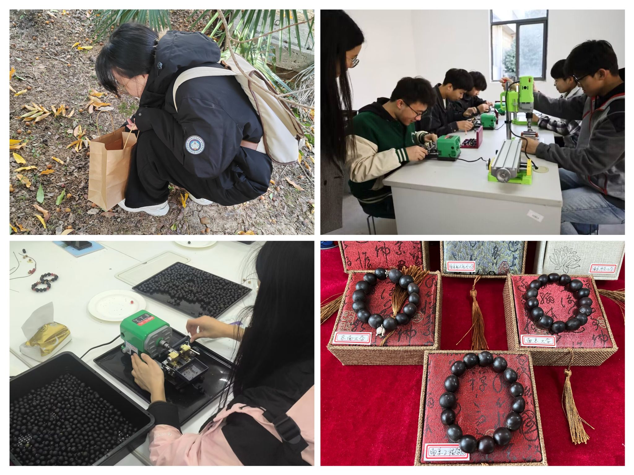 “看到学长学姐们辛苦备战考研,大家想尽一份心意。我们学校有丰富的生态资源,无患子、栾树、矮棕榈等植物的种子都可以制作成祝福满满的手串。”谈及制作初衷,活动策划者、植茁德育工作室李苏云同学说:“这样的创意得到了大家的积极响应和学院的大力支持,工作室迅速在校内收集了大量无患子,在经过调研后,我们又赶赴学长学姐们升学意向较高的东南大学、南京航空航天大学,一颗颗在南京各大高校校园里‘加持’的无患子经过剥皮、清洗、筛选、打孔、串绳等步骤,被赋予了新的生命。”