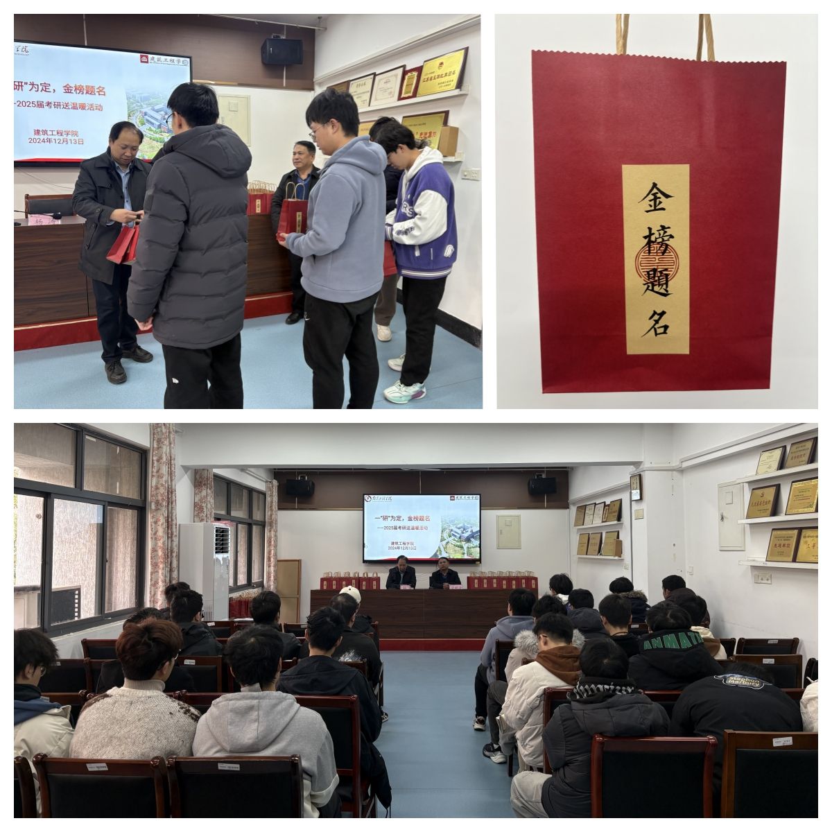 12月13日,建筑工程学院于设计南楼209会议室温情举办 “一‘研’为定,金榜题名” 考研学子送温暖活动,为考研学子加油鼓劲,舒缓其备考压力。学院党委书记杨涛、党委副书记管明清、学工办老师和考研学生代表参加了本次活动。