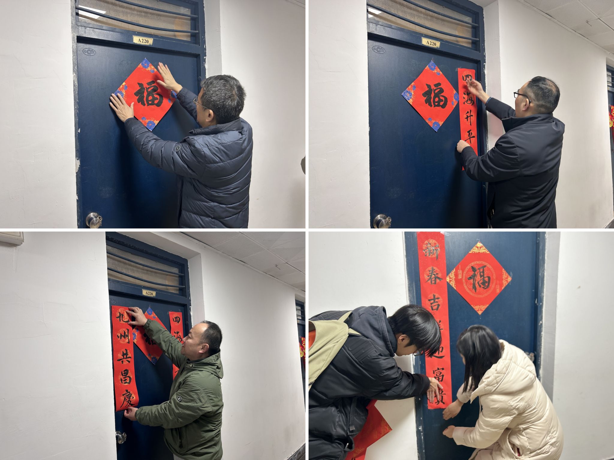 宿舍门前,老师们左手拿着春联,右手持着“福”字,“古人在立春日多贴‘宜春’二字,后渐渐发展为春联,表达了中国劳动人民辟邪除灾、迎祥纳福的美好愿望。”学院关工委教师王少平一边在学生宿舍张贴,一边介绍道。此次活动营造了学生社区欢乐祥和、团结友爱的节日氛围,让同学们真切体会 “家” 的温馨和 “年” 的热闹,也让同学们在实践中领悟中华优秀传统文化,鼓舞同学们在日常学习生活中做中华优秀传统文化的守护者和弘扬者。