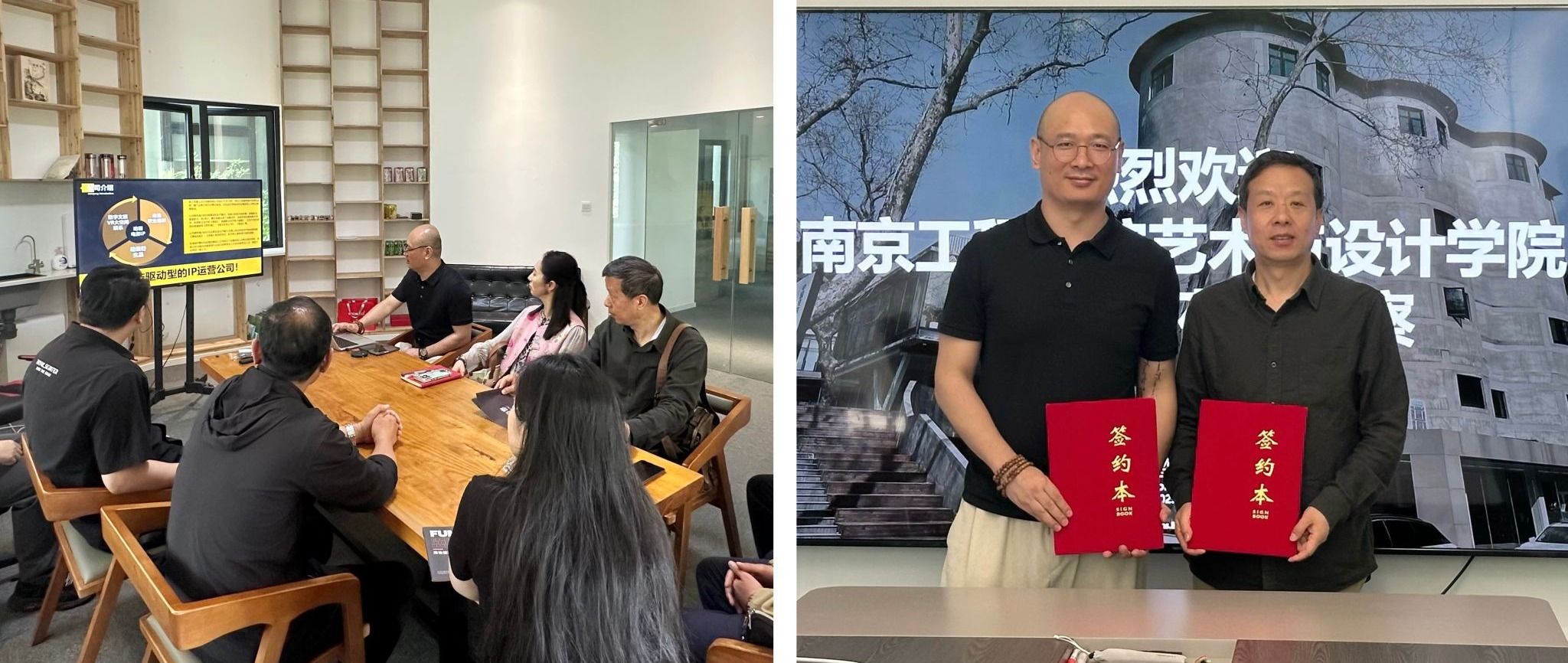 在浙江花果山传媒文化有限公司,杨成立介绍了学院专业建设、人才培养等情况,表示如何将企业需求有效融入日常教学是亟待解决的问题。合伙人刘柱提出应用型人才培养需紧密联系市场实际开展教学,最核心的竞争力是提高审美,站在企业角度进行授课。会后,双方签署《校企战略合作框架协议》及《共建高校毕业生就业基地协议》,并为“艺术与设计学院大学生就业(实习)基地”授牌,双方将持续推动高水平产学研合作、应用型人才培养及师资队伍合作。