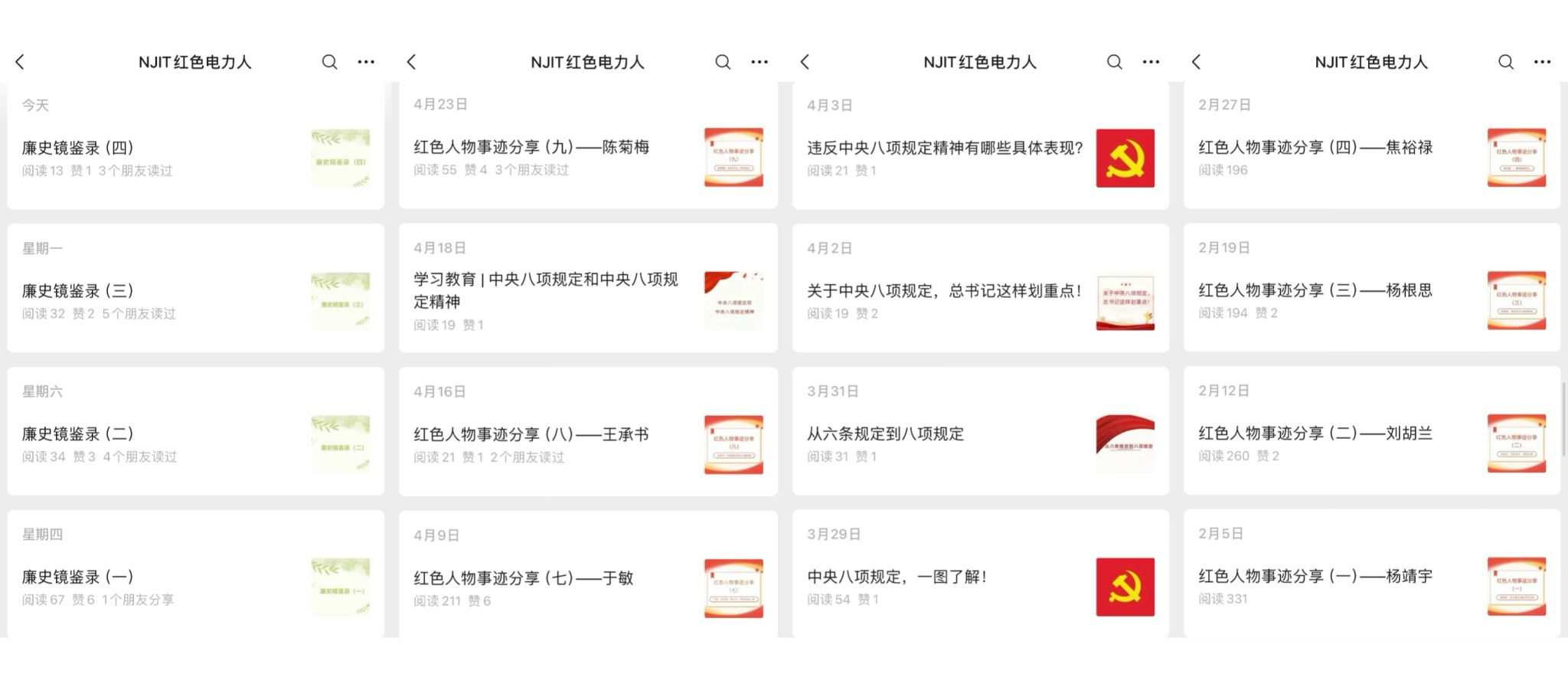 弘扬廉洁文化,浸润廉洁“心田”。学院构建“线上+线下”廉洁文化立体宣教矩阵,利用走廊、大厅展板,在“NJIT红色电力人” 公众号开设“廉史镜鉴录”“红色人物事迹”专栏,通过讲述廉洁故事、弘扬红色文化,增强教师以德立身、清正廉洁的思想意识。