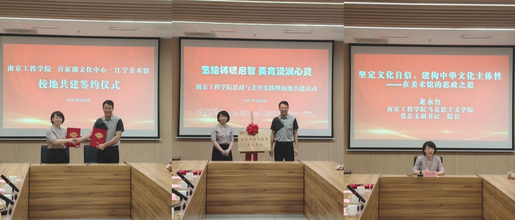 6月4日下午,马克思主义学院与百家湖文化中心在百家湖文化中心·江宁美术馆举办“艺绘铸魂启智,美育浸润心灵”思政与美育实践活动暨校地共建签约揭牌仪式。百家湖文化中心(江宁美术馆)党支部书记尹世宏、江宁美术馆馆长夏皓,马克思主义学院院长龙永红、副院长刘小红及师生代表共同参与。