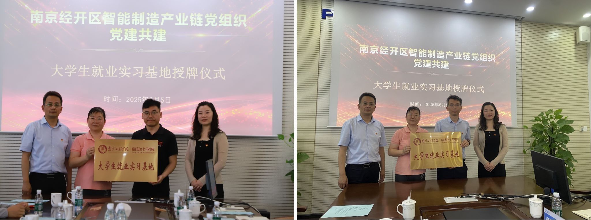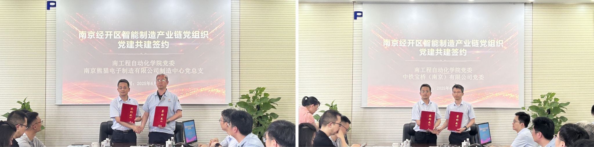 签约仪式上,学院党委与南京熊猫电子制造中心党总支、中铁宝桥(南京)党委签署党建共建协议;自动化教工党支部、机器人教工党支部、智能制造教工党支部、测控教工党支部分别与熊猫电子表面装联党支部、南京泰普森党支部、中铁宝桥行管党支部、康尼综合党支部结对共建,明确通过组织联建、资源联享、活动联办推动党建与业务深度融合。活动现场,学院为南京熊猫电子制造有限公司、南京康尼机电股份有限公司、中铁宝桥(南京)有限公司等企业颁发“大学生就业实习基地”牌匾。各方围绕智能制造领域技术前沿、产业趋势、企业需求及高校科研成果转化等展开深入探讨,达成多项合作共识。