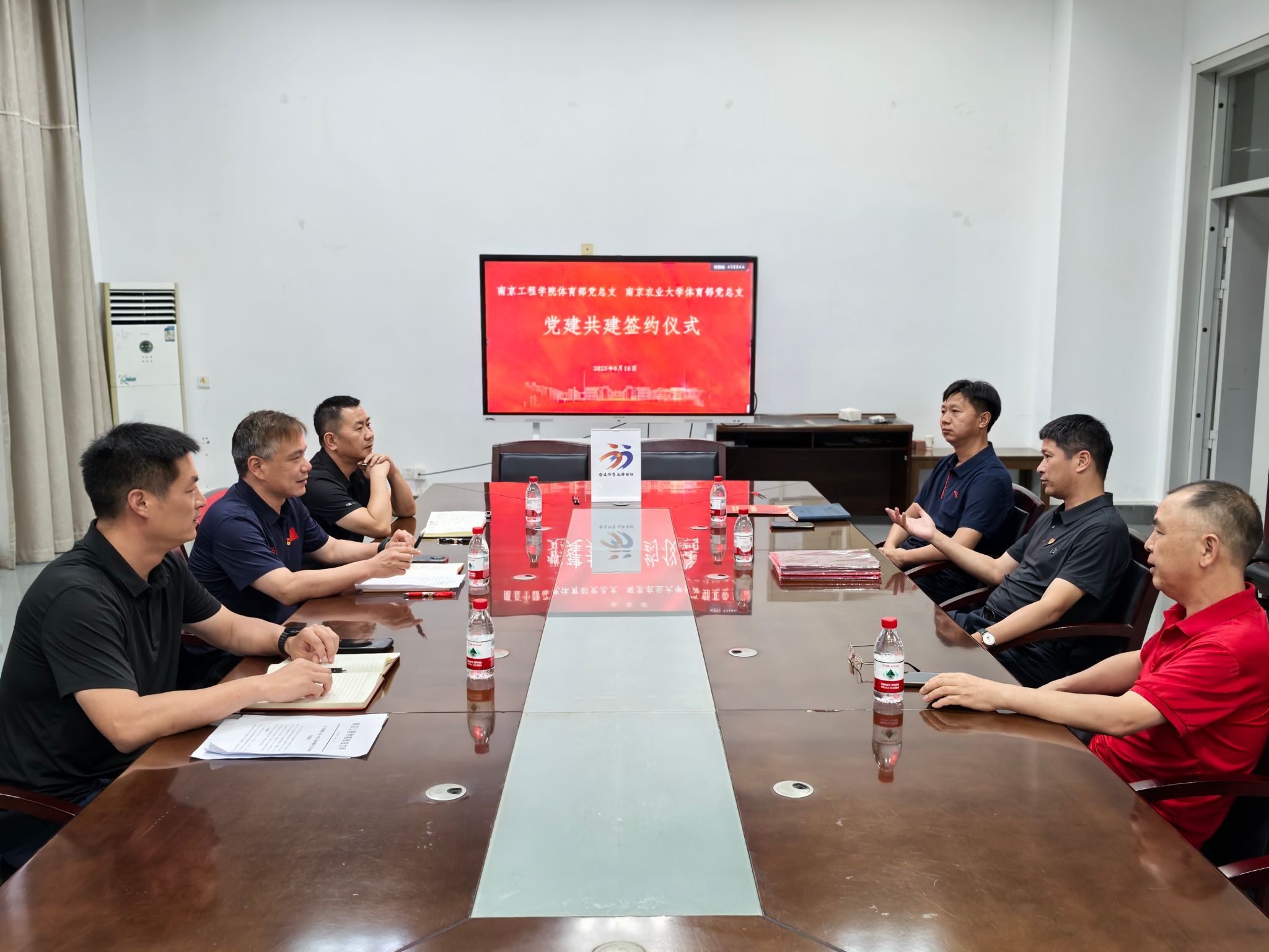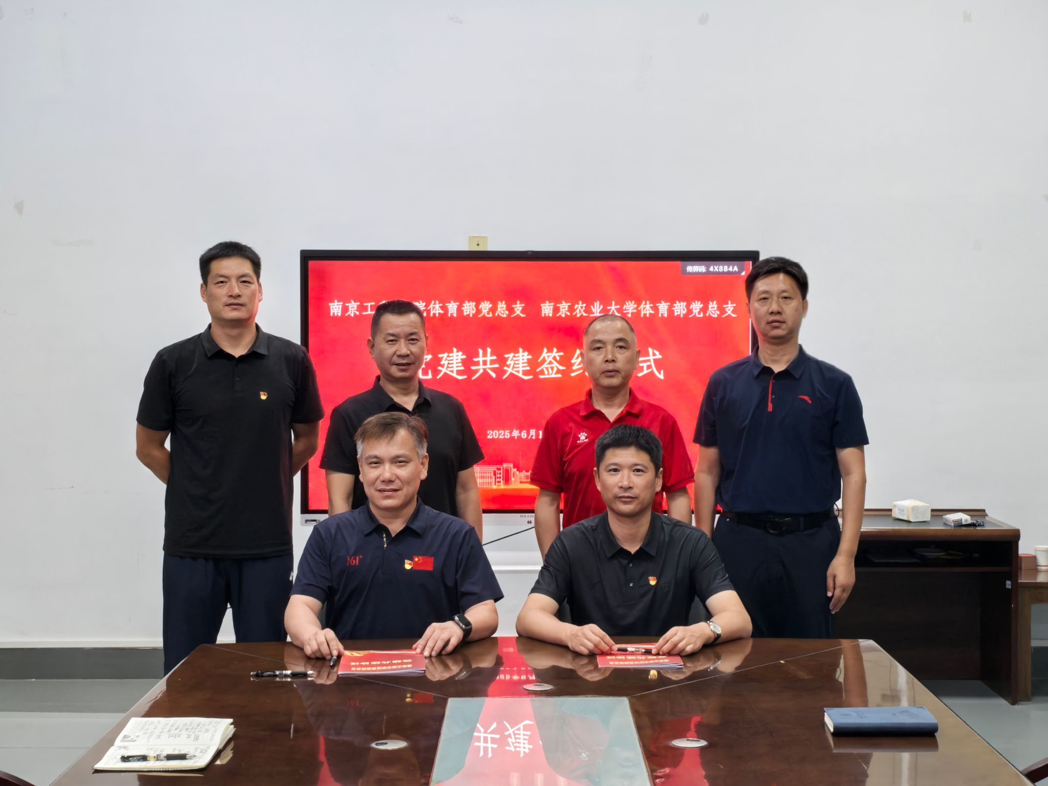 会上,陆东东介绍了南京农业大学体育部以“球不落地 永不放弃”体育精神为核心的党建模式,以及“人人进体育社团”工程提升学生体质、破解党建与业务融合发展难题的实施成效。赵伟分享了以中华体育精神赋能党建品牌建设的做法,包括联合训练备战省运会、共建数字化武术博物馆等特色活动,激发党员先锋模范作用。双方共同签署党建共建协议,在师资与课程共建、赛事与社团联动、思政与精神传承等方面深化合作,以“奋进体育、引领先锋”为核心理念,通过共享优质资源、创新活动形式、弘扬时代楷模精神等举措,共同打造具有示范意义的“党建+体育”高校合作样板。