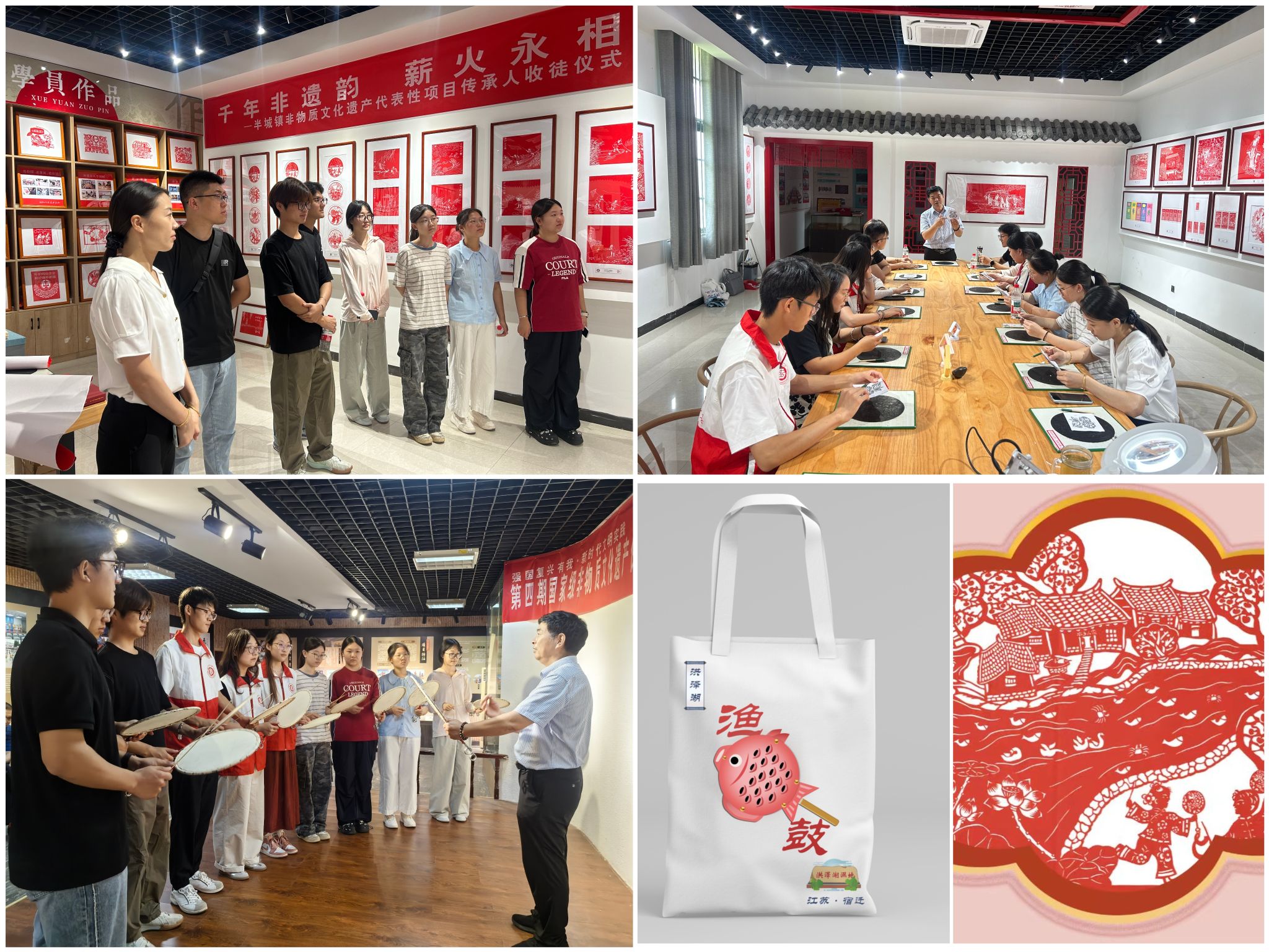 两校学子深入泗洪县文化艺术中心、泗洪县博物馆及半城镇文化站,系统了解洪泽湖渔猎文明发展脉络及非遗生态,探寻渔鼓兴衰与刻纸艺术价值,在非遗传承人张仁高老师的指导下,执刀刻绘“柿柿如意”和击鼓学唱,沉浸式感受非遗魅力与匠心传承信念,并走进学校、爱心暑托班进行宣讲。计算机学子发挥专业所长,精心设计了一系列融合渔鼓与刻纸元素的文创产品,如环保袋、书签、明信片等,创意赋能非遗传承与宣传,得到了张仁高老师等传承人的高度认可。