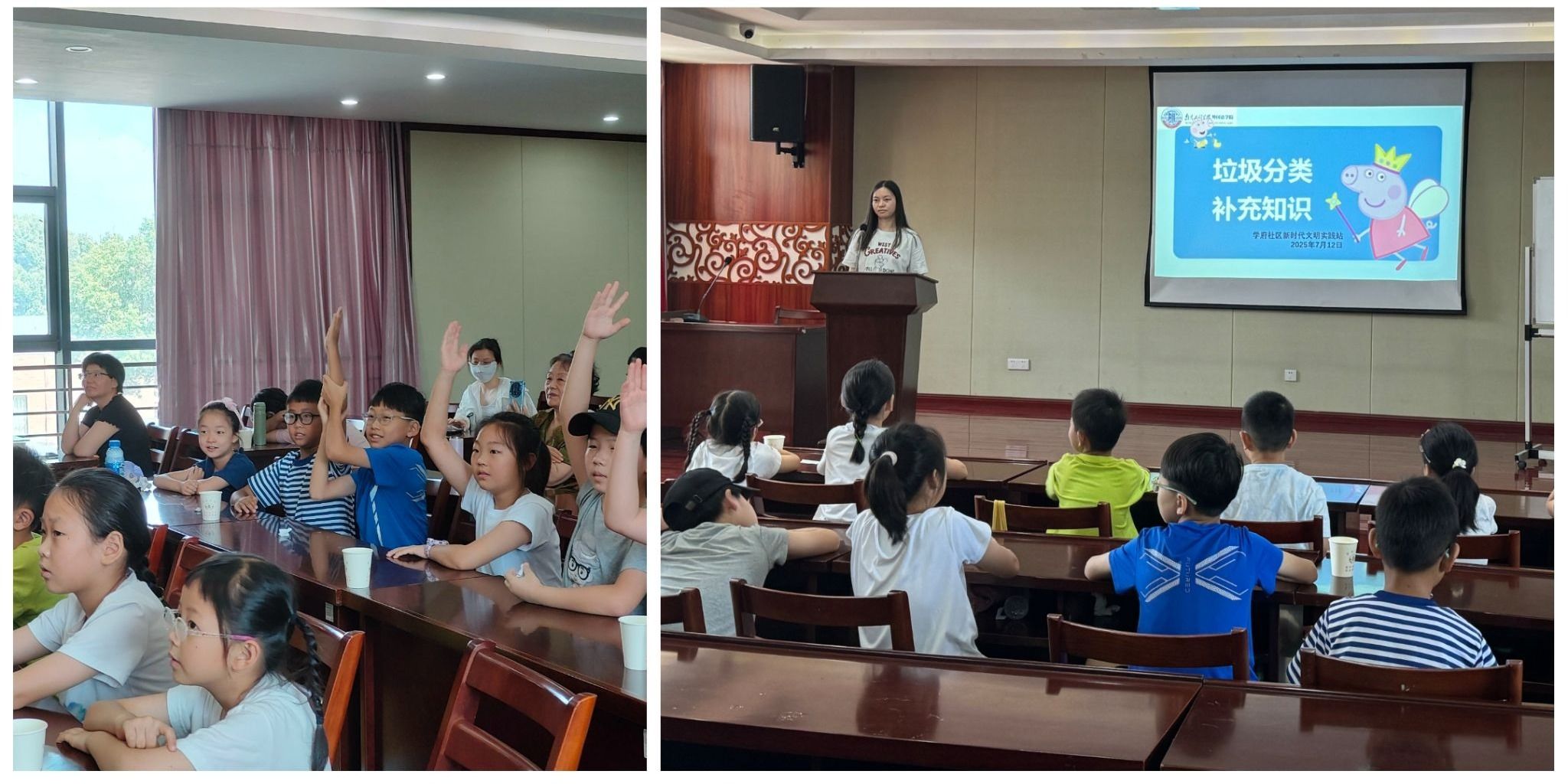 多彩课程润童心,暖心实践促成长。在月牙湖街道苜蓿园社区,实践团以警示教育案例、动画短片、情景模拟等形式,生动讲解用电安全、防溺水、防诈骗等知识,有效提升儿童安全意识和应急能力。在苏州学府社区,实践团创新设计英语互动游戏和垃圾分类实践活动,通过动画教学、单词游戏和模型演示等方式,生动传播环保理念。
