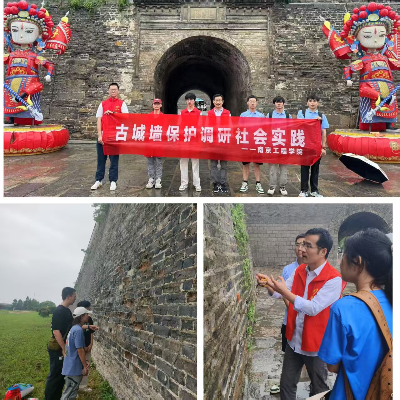 在凤阳古城墙,团队聚焦“古城墙砖保护与糯米灰浆研发”主题,系统记录墙砖风化、裂隙及植被侵蚀情况,为保护方案积累一手数据;在寿县古城墙,成员们小心采集砖缝中的糯米灰浆样本,计划通过实验室检测还原古法配方,探索融入现代材料以提升耐久性,助力古城墙修复工作。